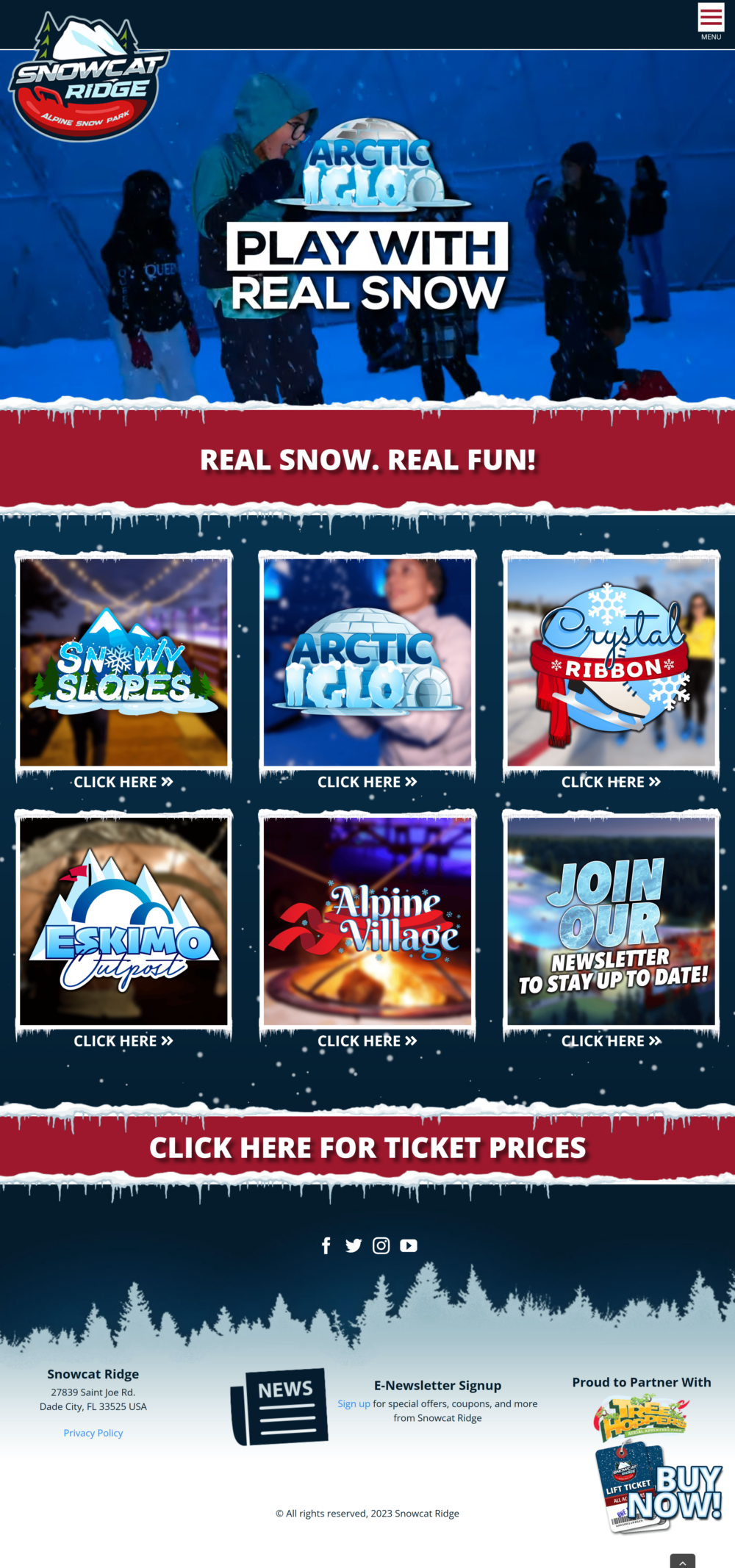 Snowcat Ridge is the first Florida Snow Park of its kind featuring snow tubing, snow play, and an Alpine Village. Snowcat Ridge includes a 60-foot-tall, 400-foot-long snow tubing hill, along with a magic carpet lift which will whisk riders and their snow tubes to the top of the hill. Guests will be provided with single, tandem and 6-person family tubes to slide down the snow-covered slope.